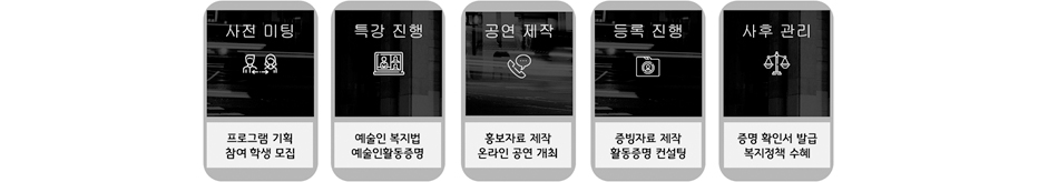 졸업과 동시에 국가에서 인정하는 신진예술인 등록 및 예술인으로서의 활동을 이어 갈수 있도록 경험을 쌓고 졸업 이후에도 사후관리 또한 지원하고자,