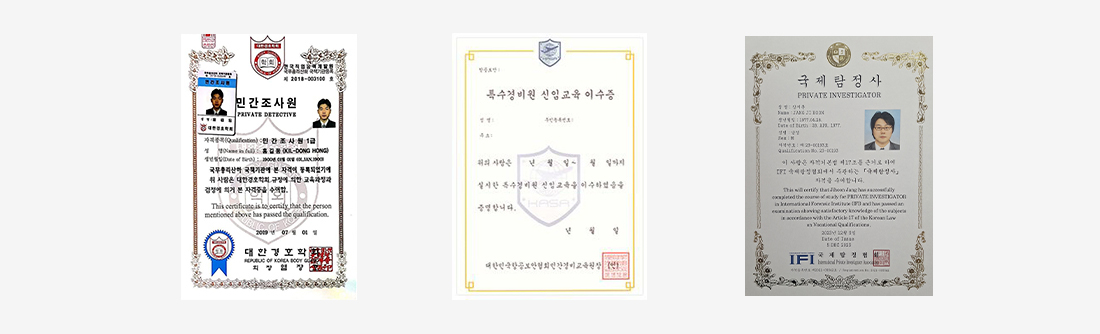 | 민간조사원 자격 취득 | 특수경비이수증 | 탐정 자격증 취득 |