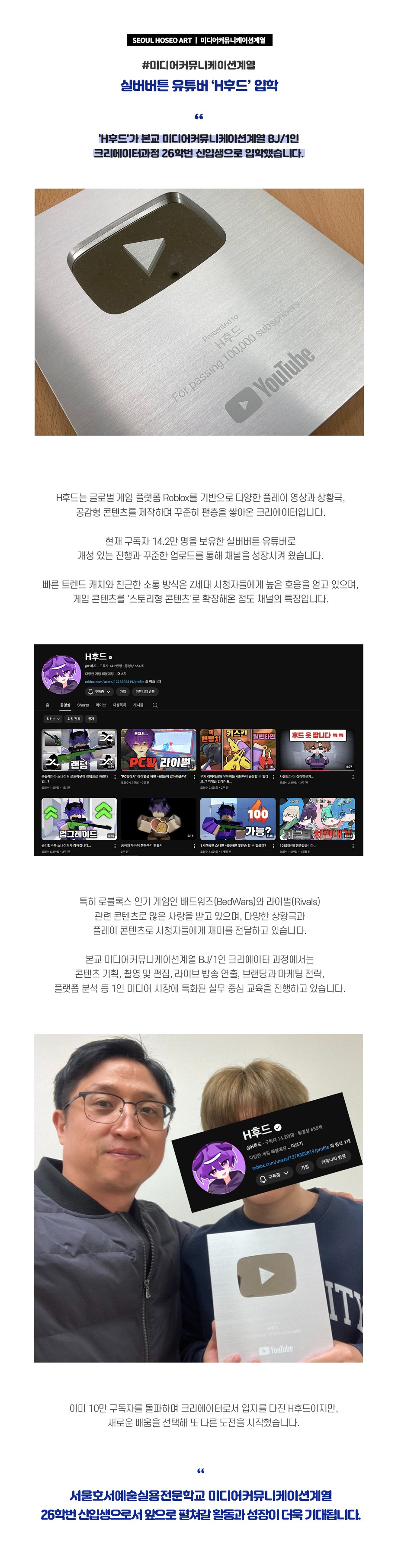 유튜버 'H후드'가 본교 미디어커뮤니케이션계열 BJ/1인 크리에이터과정 26학번 신입생으로 입학했습니다.
