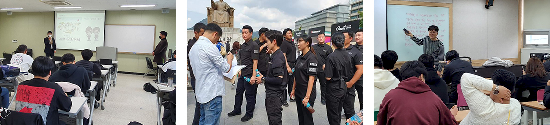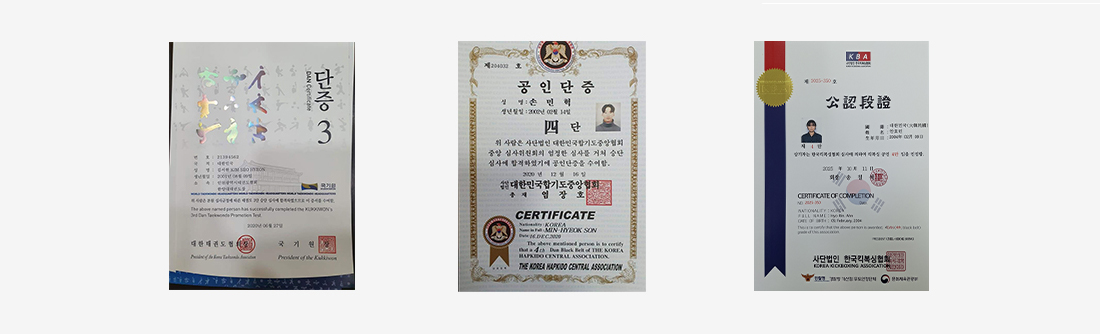 경호·경비 분야에 필요한 무도를 체계적으로 수련하여 태권도·합기도·킥복싱 등 종목의 단증 취득을 지원합니다.