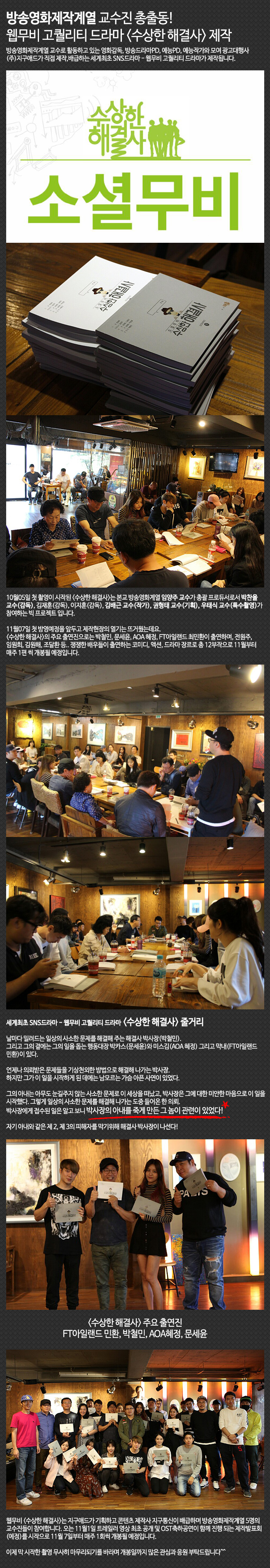 방송영화제작계열 교수로 활동하고 있는 영화감독, 방송드라마PD, 예능PD, 예능작가와 모여 광고대행사 (주)지구애드가 직접 제작,배급하는 세계최초 SNS드라마 - 웹무비 고퀄리티 드라마가 제작됩니다.