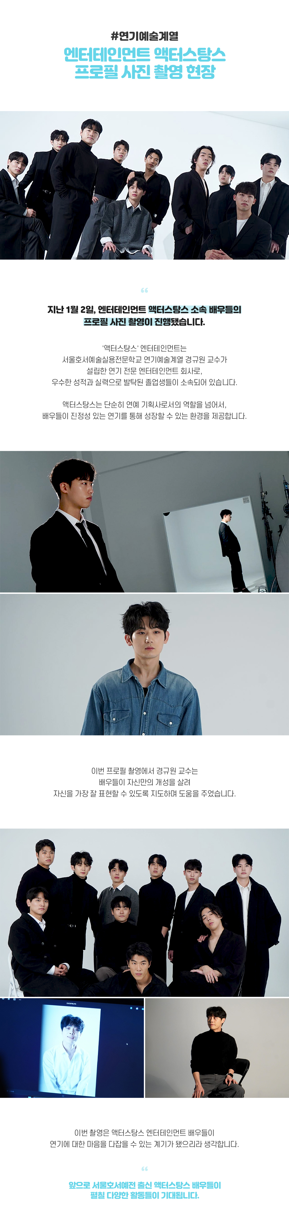 지난 1월 2일 엔터테인먼트 액터스탕스 소속 배우들의 프로필 사진 촬영이 진행됐습니다. '액터스탕스' 엔터테인먼트는 서울호서예술실용전문학교 연기예술계열 경규원 교수가 설립한 연기 전문 엔터테인먼트 회사로, 우수한 성적과 실력으로 발탁된 졸업생들이 소속되어 있습니다.