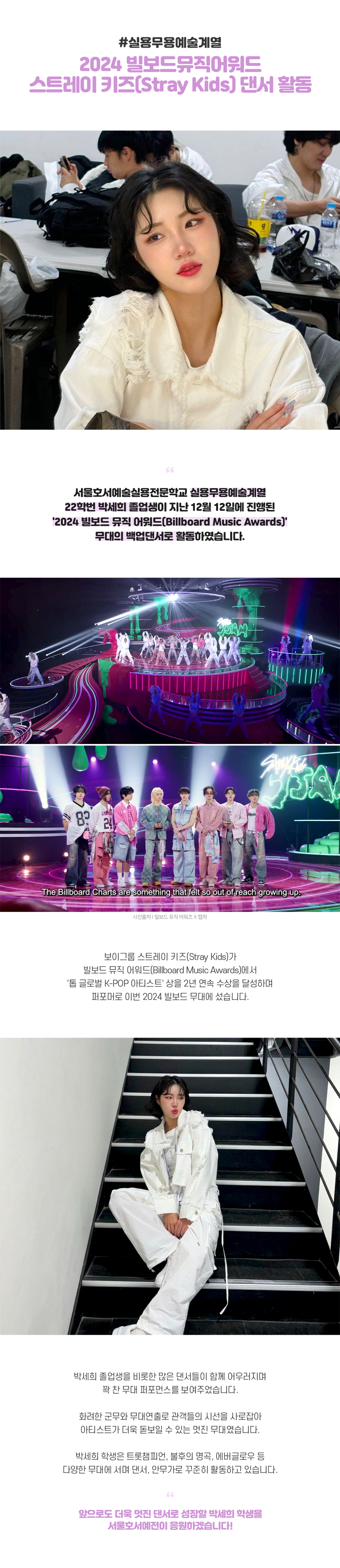 서울호서예술실용전문학교 실용무용예술계열 22학번 박세희 졸업생이 지난 12월 12일에 진행된 '2024 빌보드 뮤직 어워드(Billboard Music Awards)' 무대의 백업댄서로 활동하였습니다. 보이그룹 스트레이 키즈(Stray Kids)가 빌보드 뮤직 어워드(Billboard Music Awards)에서 '톱 글로벌 K-POP 아티스트' 상을 2년 연속 수상을 달성하며 퍼포머로 이번 2024 빌보드 무대에 섰습니다.