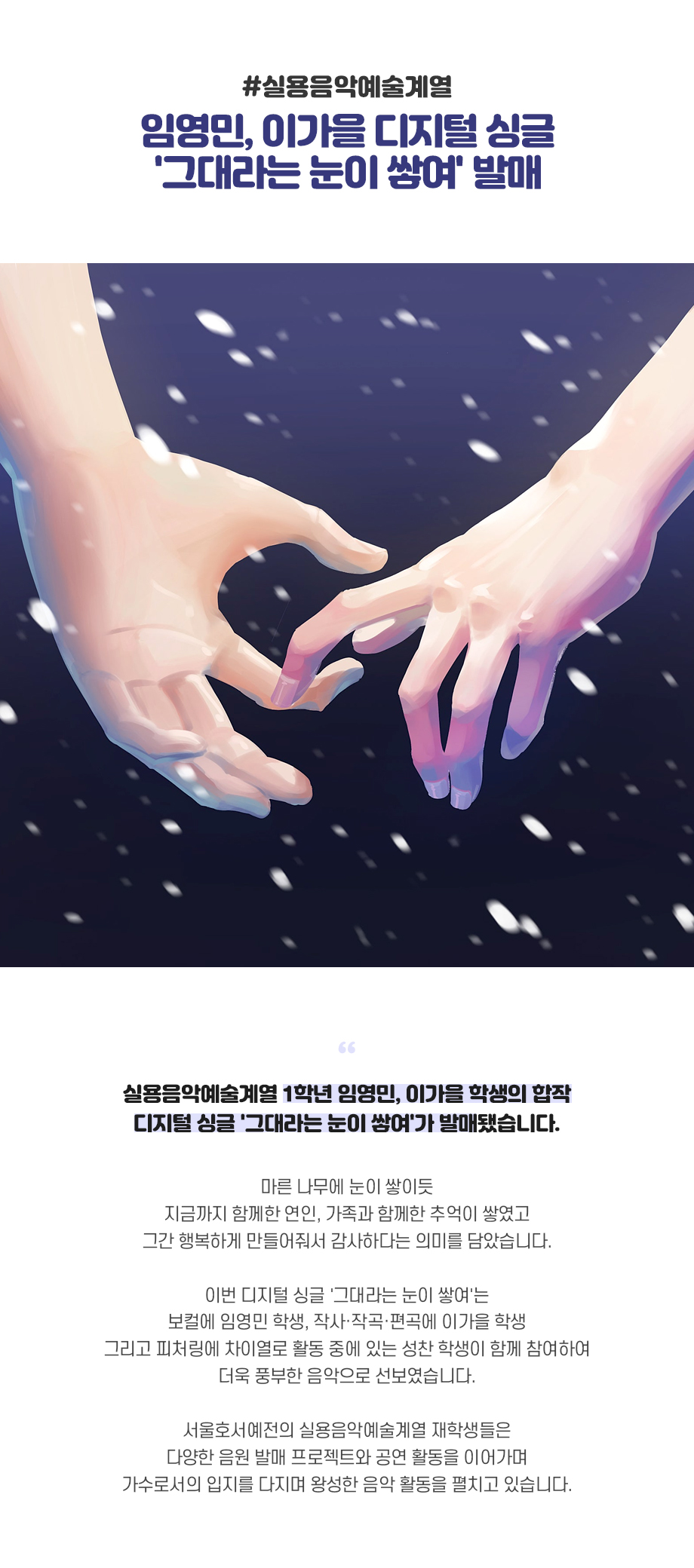 실용음악예술계열 1학년 임영민, 이가을 학생의 합작 디지털 싱글 '그대라는 눈이 쌓여'가 발매됐습니다. 마른 나무에 눈이 쌓이듯 지금까지 함께한 연인, 가족과 함께한 추억이 쌓였고 그간 행복하게 만들어줘서 감사하다는 의미를 담았습니다.