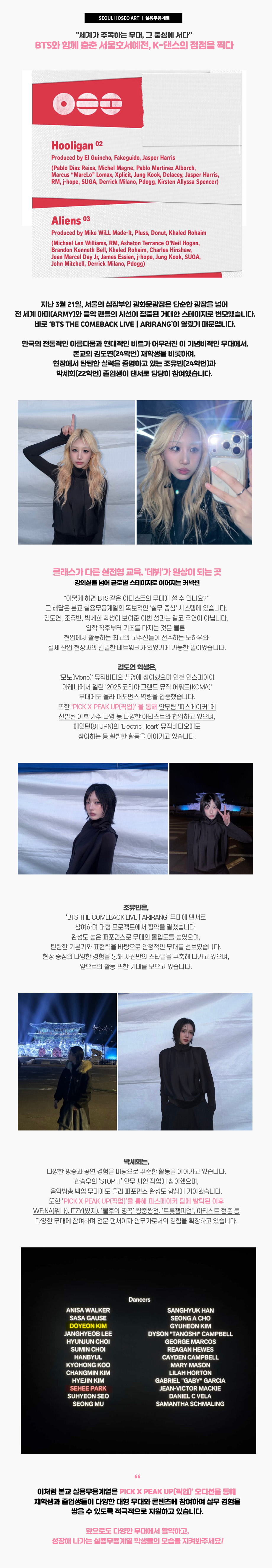 서울호서예술실용전문학교 실용무용예술계열 재학생 김도연(24학번)과 졸업생 조유빈(24학번), 박세희(22학번)가 지난 3월 21일 서울 광화문광장 일대에서 진행된 ‘BTS THE COMEBACK LIVE | ARIRANG’ 무대에 댄서로 참여하였습니다.
