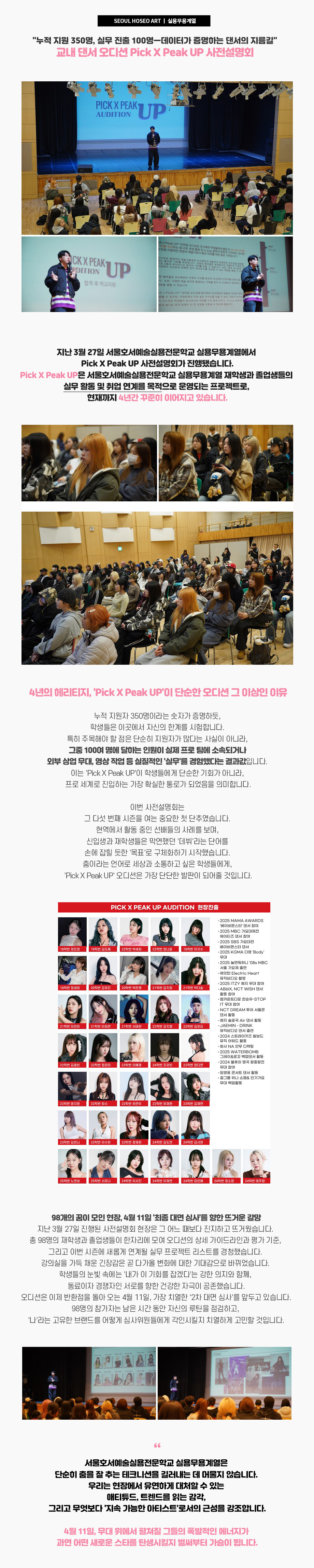 지난 3월 27일 서울호서예술실용전문학교 실용무용계열에서 Pick X Peak UP 사전설명회가 진행됐습니다.