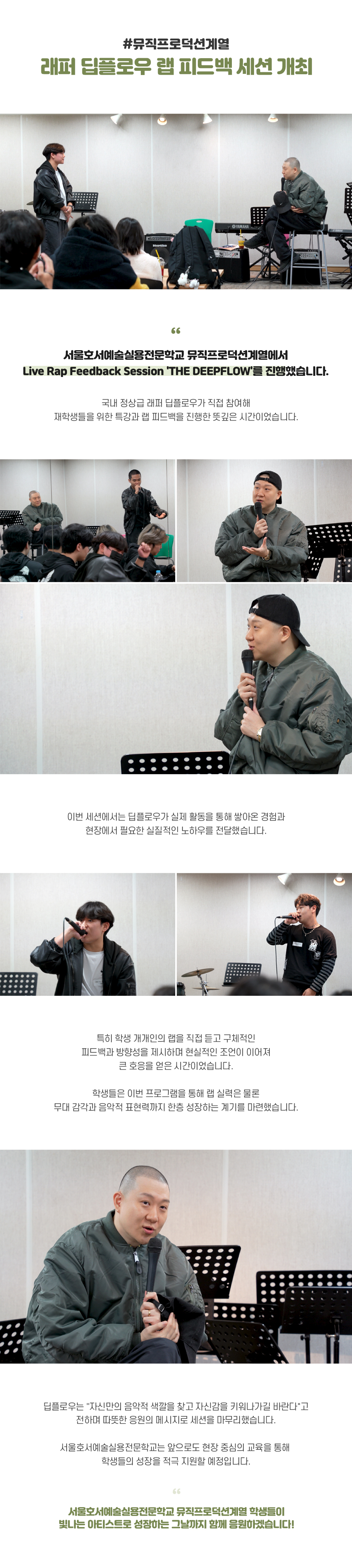 서울호서예술실용전문학교 뮤직프로덕션계열에서 Live Rap Feedback Session 'THE DEEPFLOW'를 진행했습니다. 국내 정상급 래퍼 딥플로우가 직접 참여해 재학생들을 위한 특강과 랩 피드백을 진행한 뜻깊은 시간이었습니다.