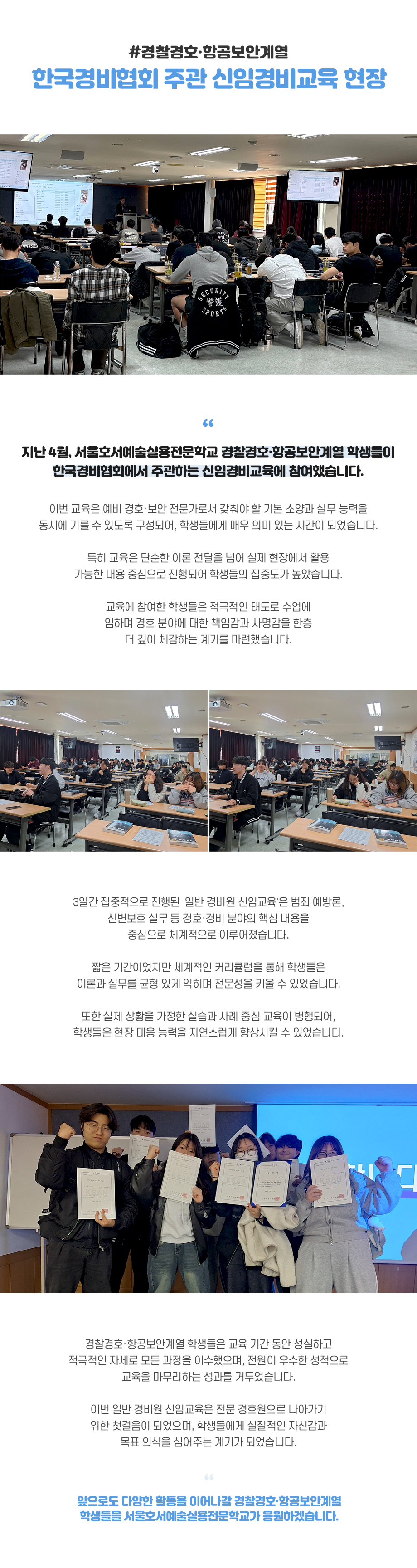 지난 4월, 서울호서예술실용전문학교 경찰경호·항공보안계열 학생들이 한국경비협회에서 주관하는 신임경비교육에 참여했습니다.