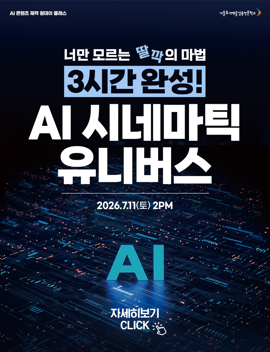 서울호서예술실용전문학교 미디어커뮤니케이션계열 AI 콘텐츠 제작 원데이 클래스 너만 모르는 '딸깍'의 마법 3시간 완성! AI 시네마틱 유니버스 신청하기